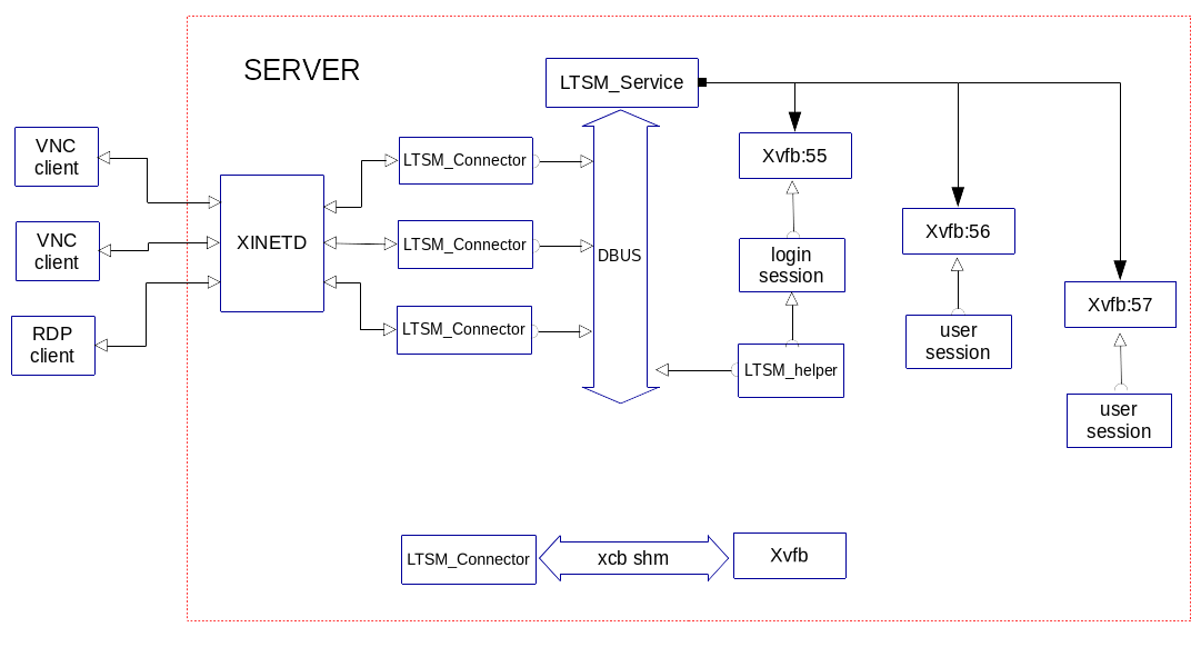 Клиенты подключаются к системе через протокол RFB или RDP на служебный сервис это xinetd/(systemd sockets), а LTSM_connector является обработчиком протокола.